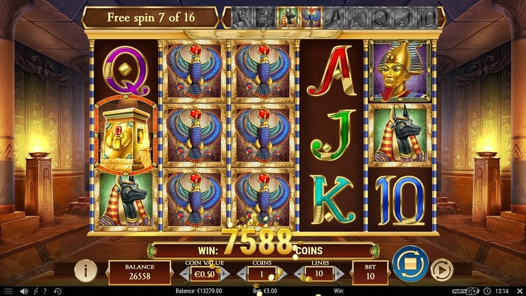 El juego base es la clásica experiencia 'Book of'. Estás a la caza de combinaciones ganadoras en las 10 líneas de pago, donde el 'Faraón' y 'Anubis' tienen los valores más altos. El símbolo de la 'Tumba Dorada' es la clave de todo: actúa como Comodín (para completar líneas de pago) y como Scatter (para activar la bonificación). Consigue 3 o más y las puertas al más allá se abrirán. El RTP estándar es un excelente 96,58% (puede variar) y la ganancia máxima es de 5.000x la apuesta.