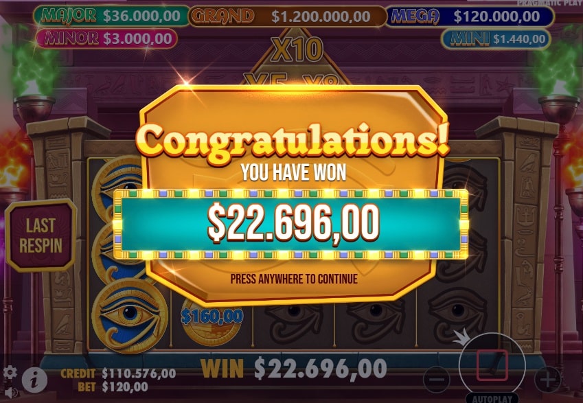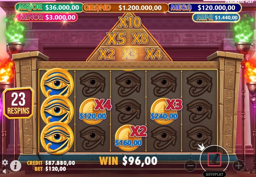 Además, se pueden ganar cinco jackpots fijos, que van desde Mini hasta Grand. Estos se obtienen cuando combinas un símbolo de Dinero de jackpot con un Eye of Horus Collect. Así, cada giro en la demo de Mummy’s Jewels podría resultar en un premio monstruoso.