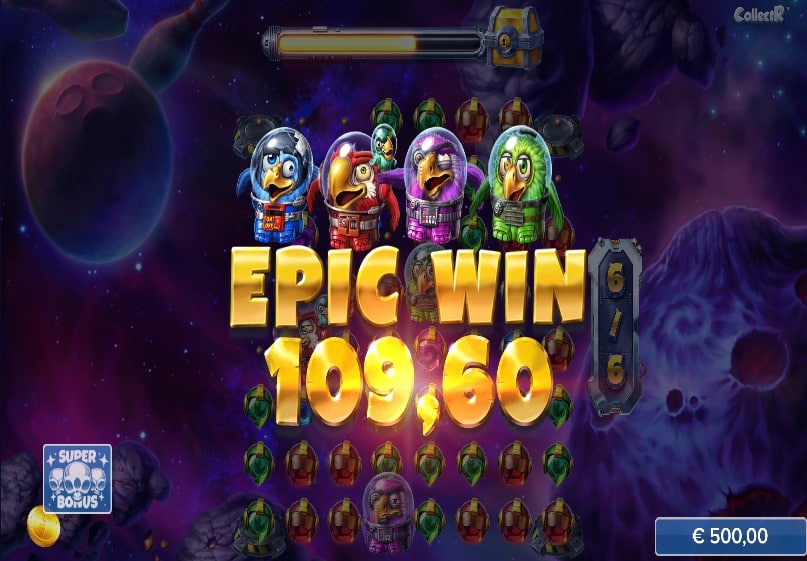 Lost in Space es una ronda de bonificación en la que recoges tantas monedas como sea posible en un campo de 8x8 con tres giros. Las nuevas monedas reinician el contador, y al final, tus pájaros se lanzan a devorarlas.